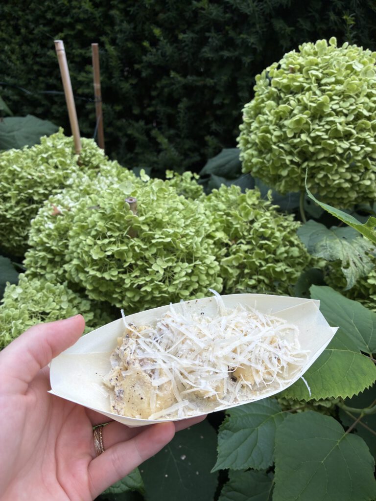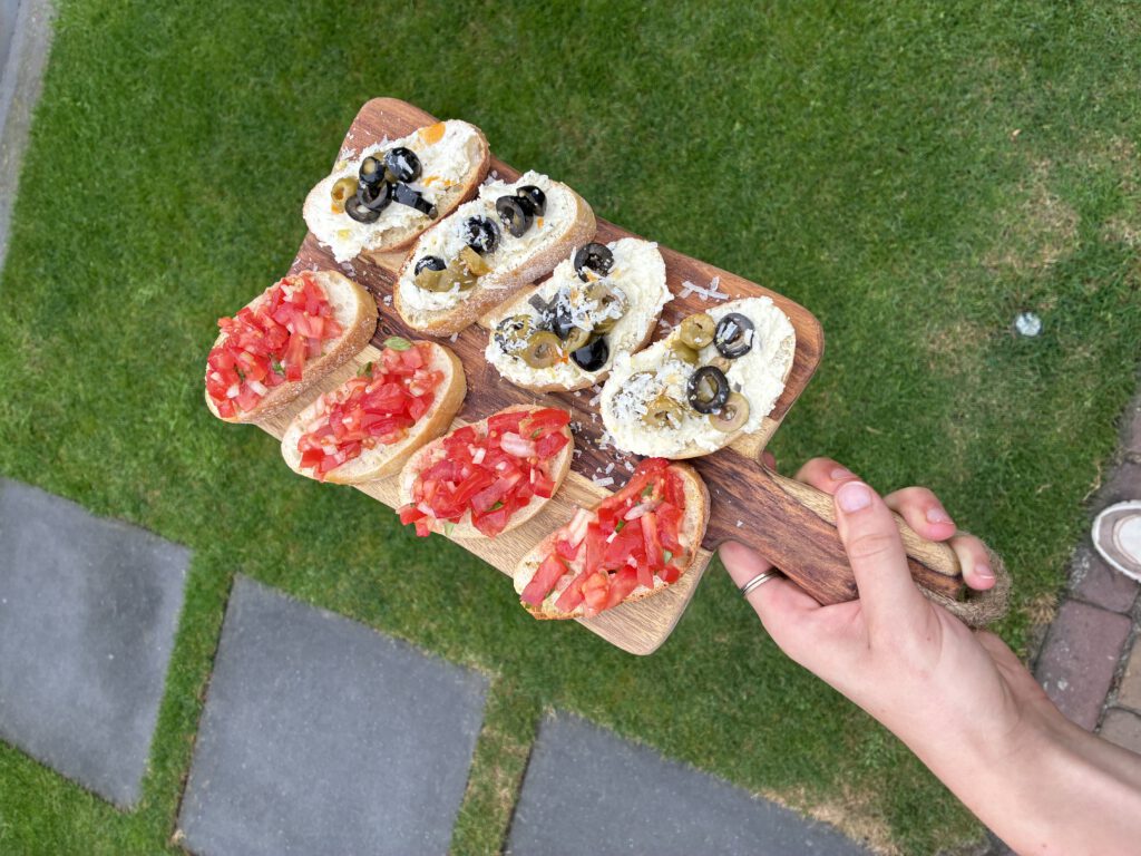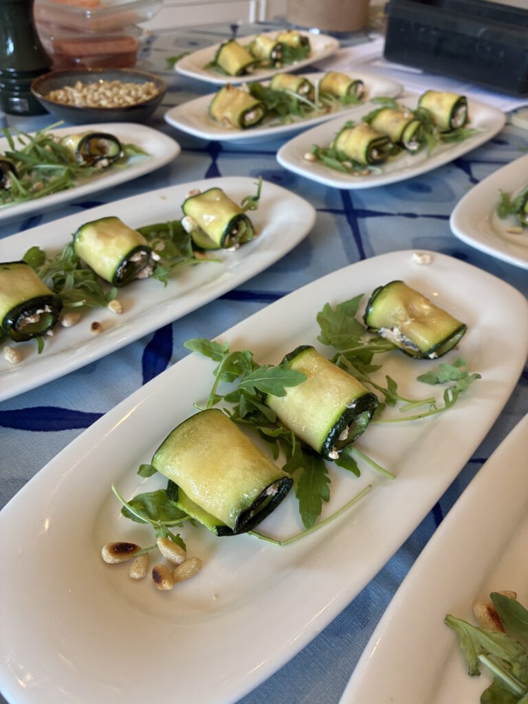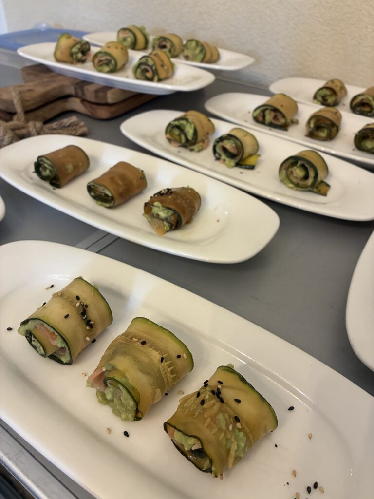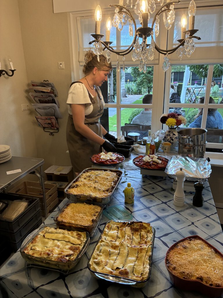 We startten met twee soorten bruschetta (de originele en een parmezaancreme met olijven), courgette rolletjes waarvan een oosterse courgette met avocado en zalm en vega variant met o.a. feta, zongedroogde tomaten, pijnboompitjes en basilicum. Als tussengerecht genoten de gasten van een verse huisgemaakte ravioli, gevuld met gemengde wilde champignons geserveerd in een truffelroomsaus. Als hoofdgerecht heb ik de gasten verwend met twee soorten lasagne, een traditionele bolognaise waarvan de pastasaus een nachtje heeft staan pruttelen en een courgette-ricotta lasagne met pistache pesto. Hierbij werden twee salades geserveerd: een gemarineerde tomatensalade met buffelmozzarella en een Italiaanse parmaham salade met citroenricotta en macadamia noten.