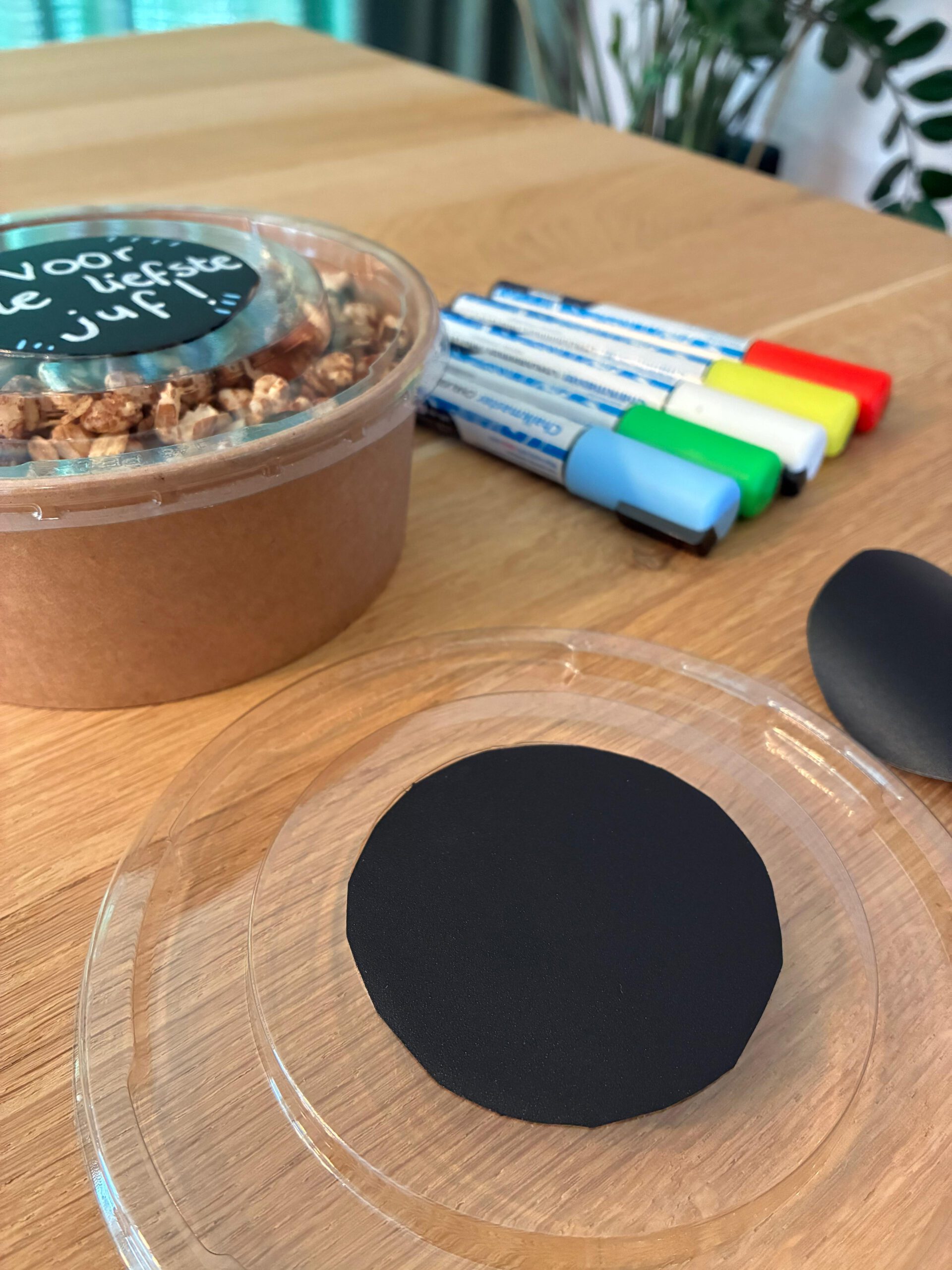 Zo kan ik mooie stickers op je bestelling plakken, waar ik met verschillende kleuren krijt stiften een persoonlijke boodschap op kan schrijven van zo’n 16 tekens, 4 woorden.